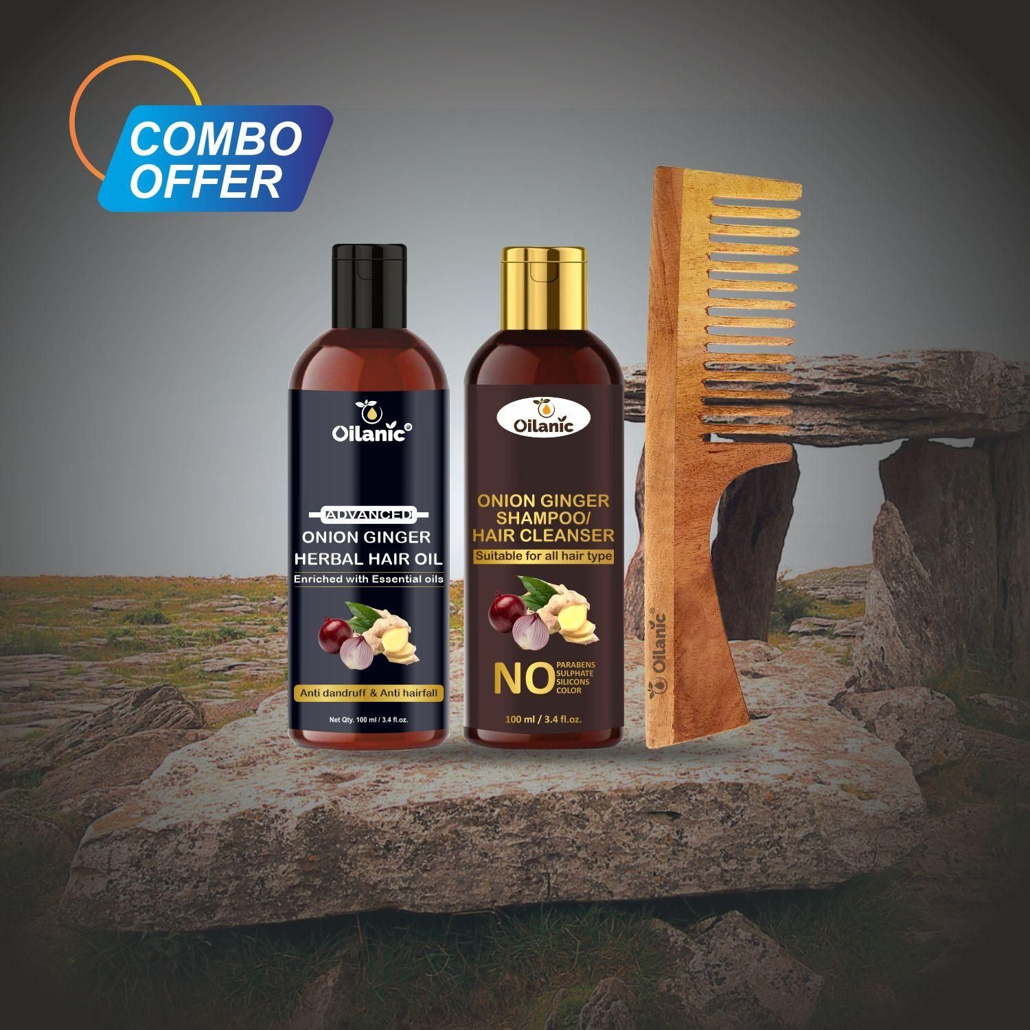 Oilanic Herbal Hair Oil, Onion Ginger Shampoo & Wooden Neem Ecofriendly Comb Combo